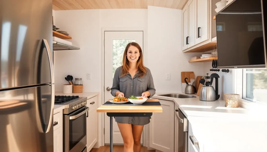 Smart storage options define tiny house kitchens. Cabinets that reach the ceiling provide much-needed storage without taking up valuable floor space. Choosing appliances that serve multiple purposes, like a microwave that can also bake, saves room and enhances versatility. Foldable tables and retractable countertops establish additional prep areas without permanent structures. Drawer organizers keep utensils tidy, ensuring easy access while maintaining organization. Incorporating magnetic strips for knives or spices utilizes wall space creatively.